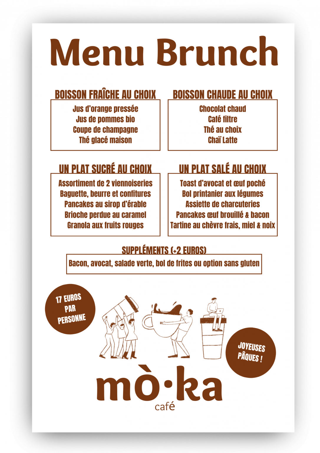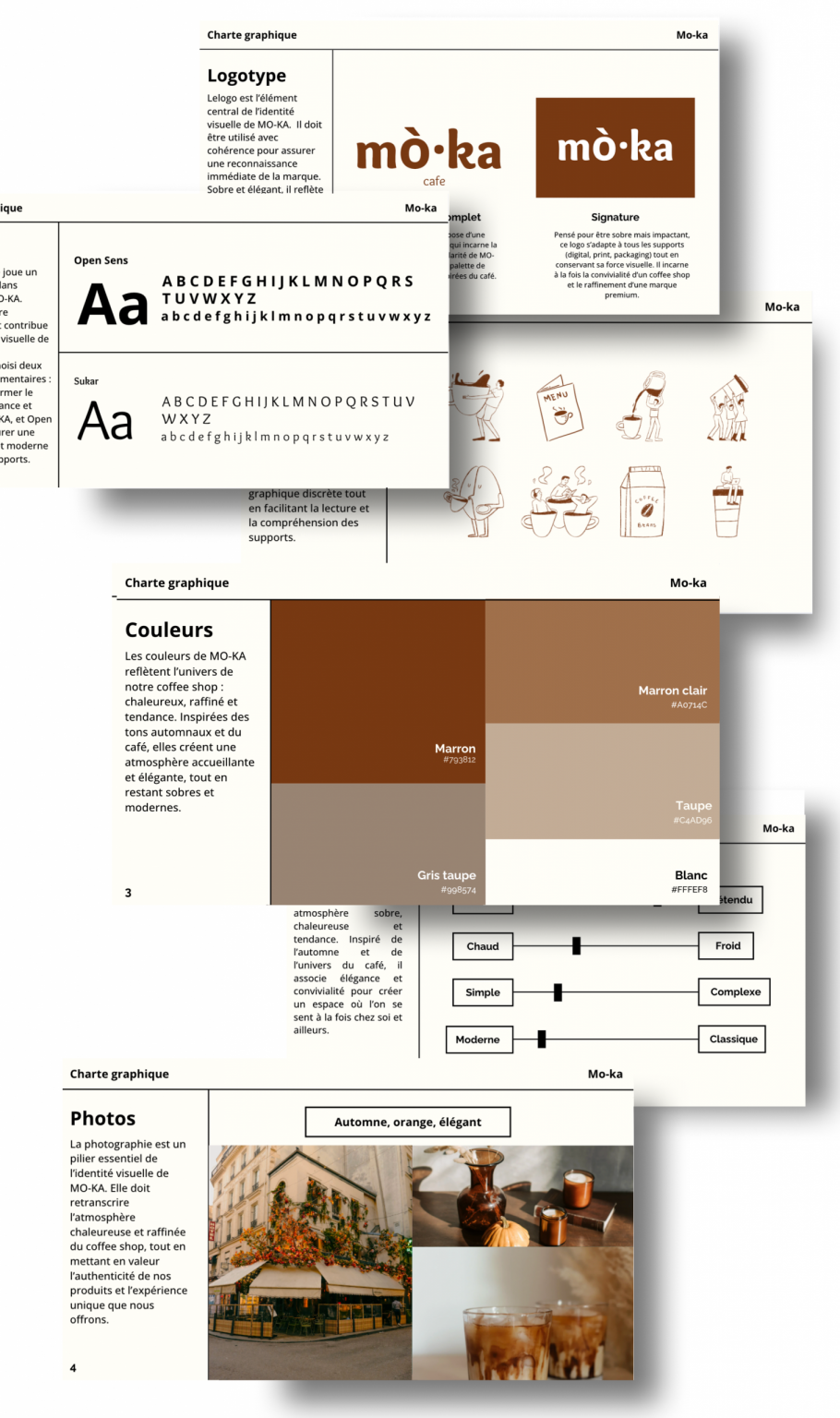 La charte graphique de Mò-ka s’appuie sur une palette épurée et chaleureuse, avec un marron profond en couleur principale, rappelant à la fois la richesse du café et la convivialité.